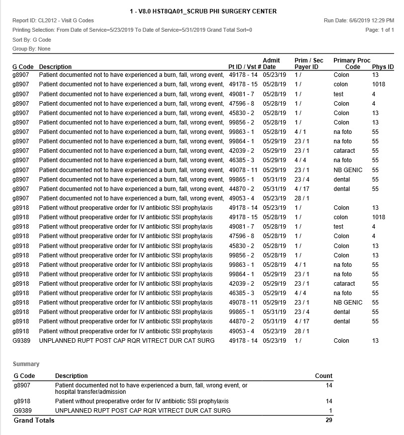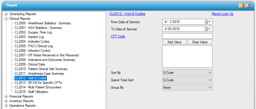 Listing of the G Codes entered in Case History, Clinical Log, for all cases within the specified date range. A grand total grouped by G Code is included.
