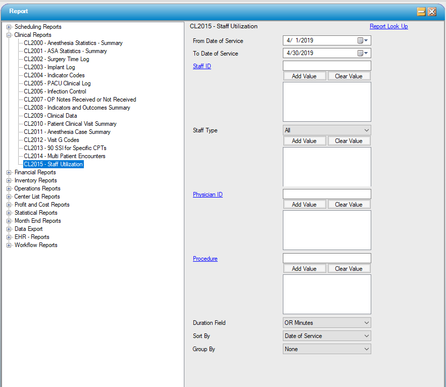 This report can be run by a variety of parameters including date of service date range, Staff ID, Staff Type, Physician, and Procedure.