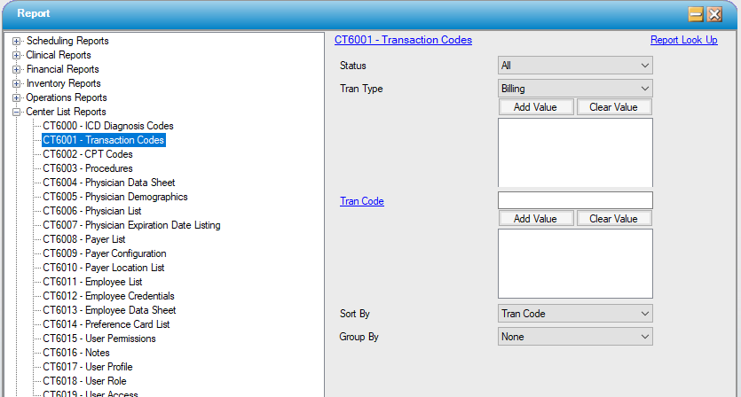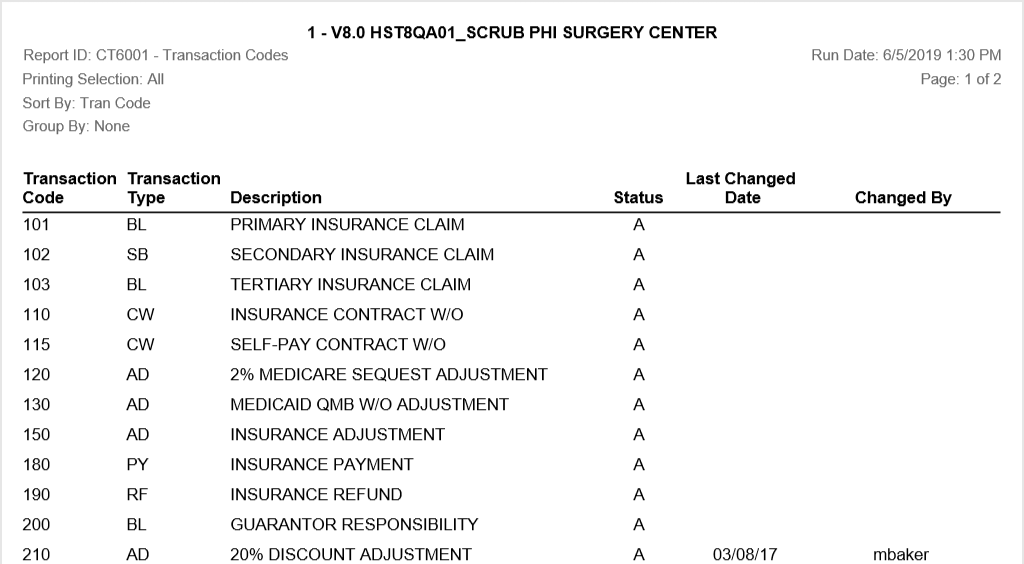 Track all billing transaction codes entered into HST Practice Management. Reads directly off the Billing Transaction Code table under the Administration menu.
