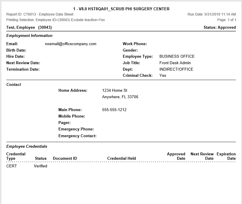 Employee Credentials:  Displays the information for each Credential Type entered on the Credentials tab, including status, next review date, and expiration date.