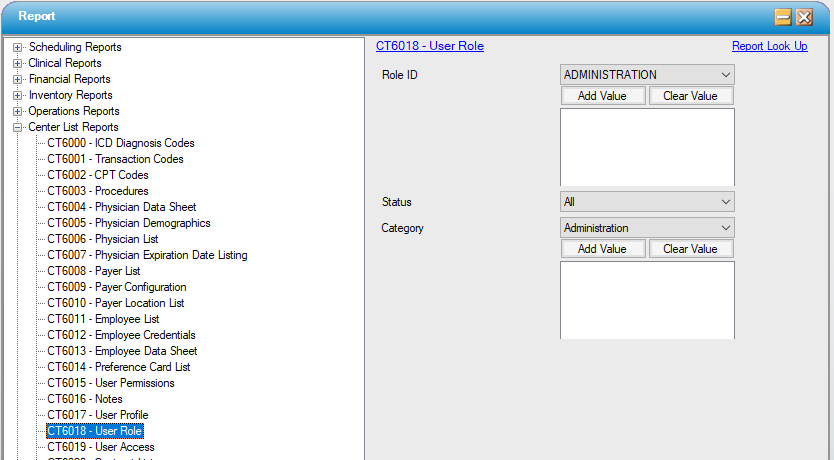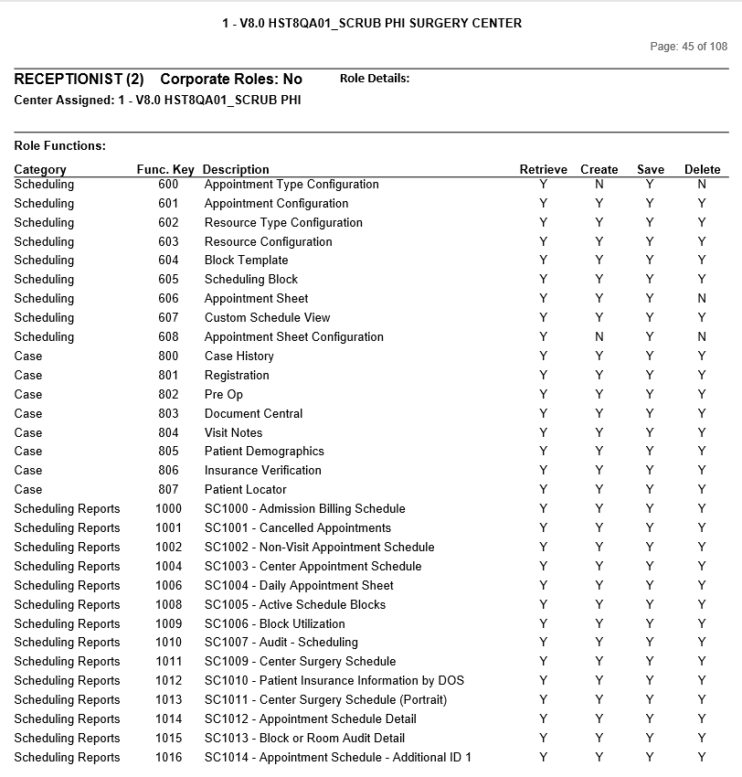 Displays the User Roles on a Corporate or Center Level with assigned Functions within that role. Reads directly from Administration, User Permission, User Roles. This report does not reflect individual user permissions.
