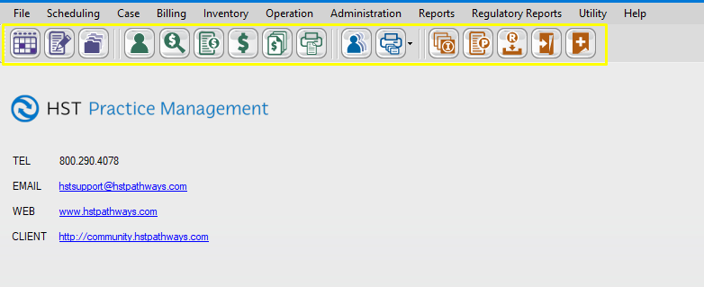The HST Practice Management Home Page contains a toolbar with multiple navigation icons (shown below) which represent the most commonly used forms.