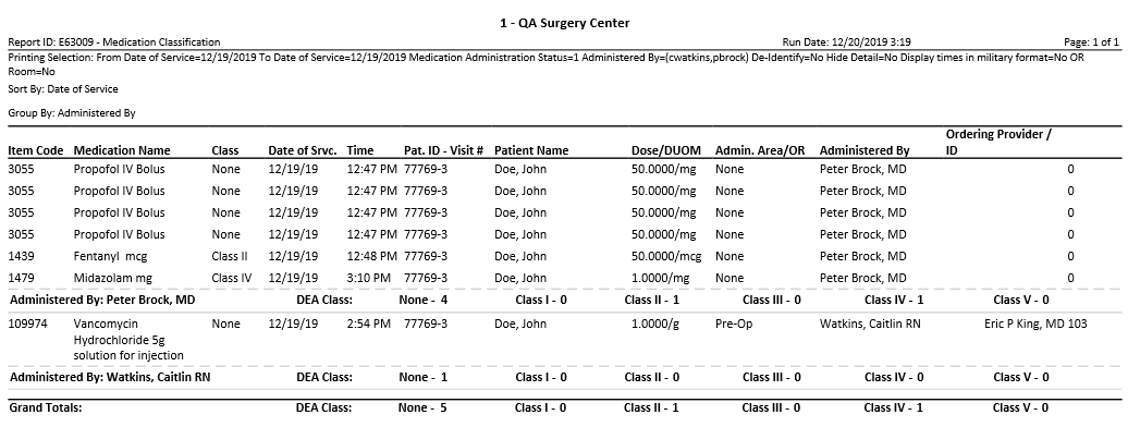 - Grouping options: Date of Service, Patient, Administered By, Medication Name, Ordering Provider, Classification Schedule, Administration Status, OR Room, and Item Code
