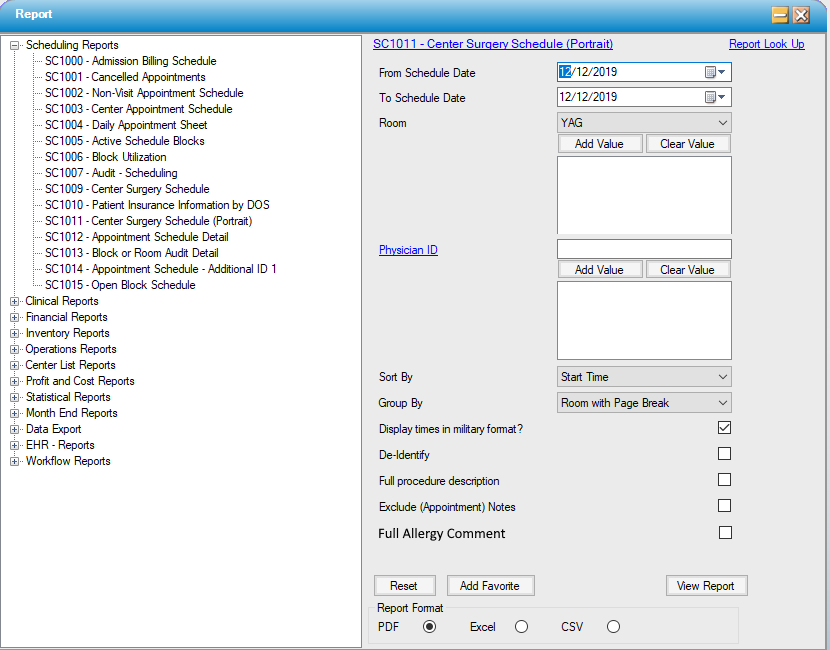 - Enter the desired scheduled date range; or run by specific Room(s) or Physician ID(s).